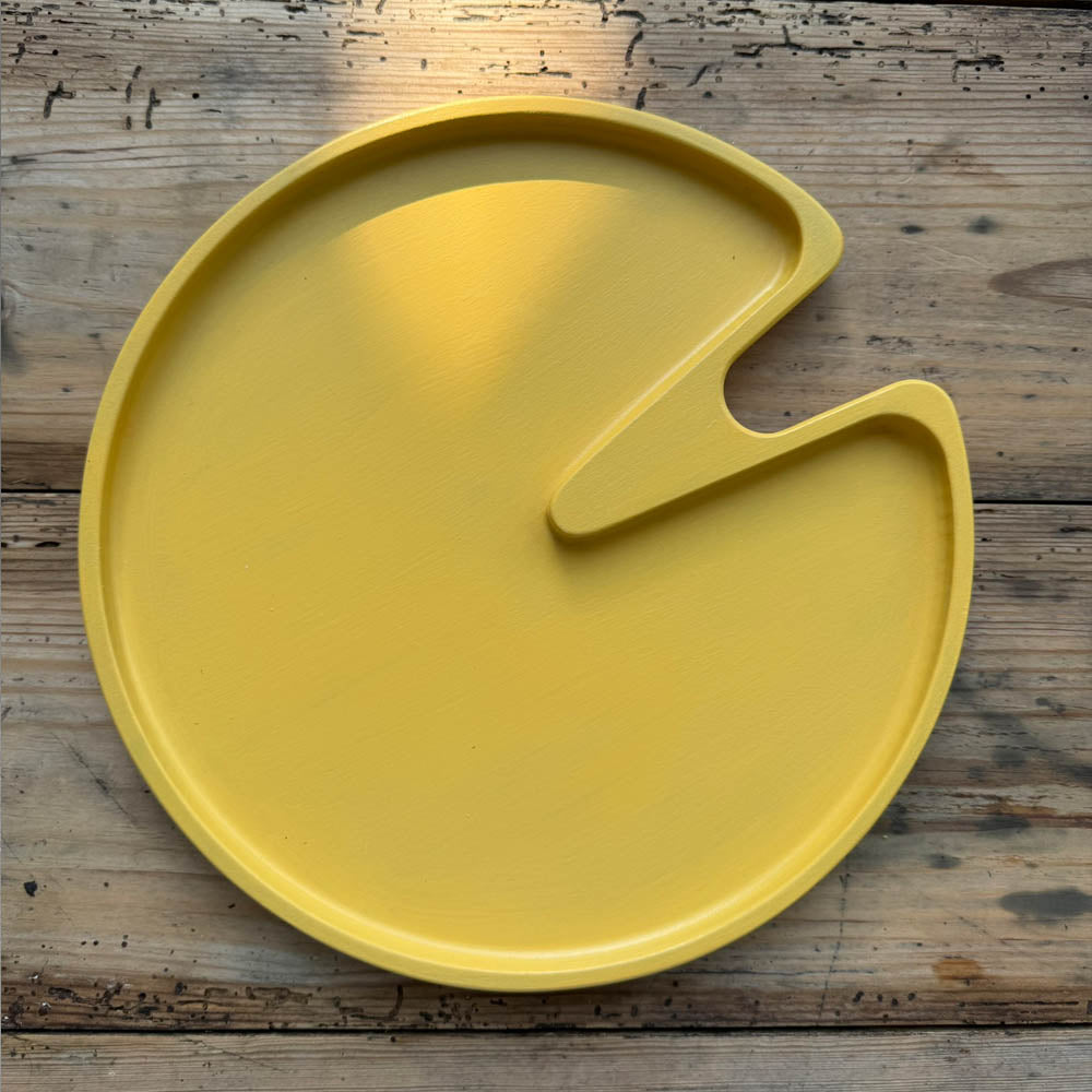 Dieses Seerosentablett aus Buchenholz ist mit AURO-Lack in einem warmen Safrangelb gestrichen.